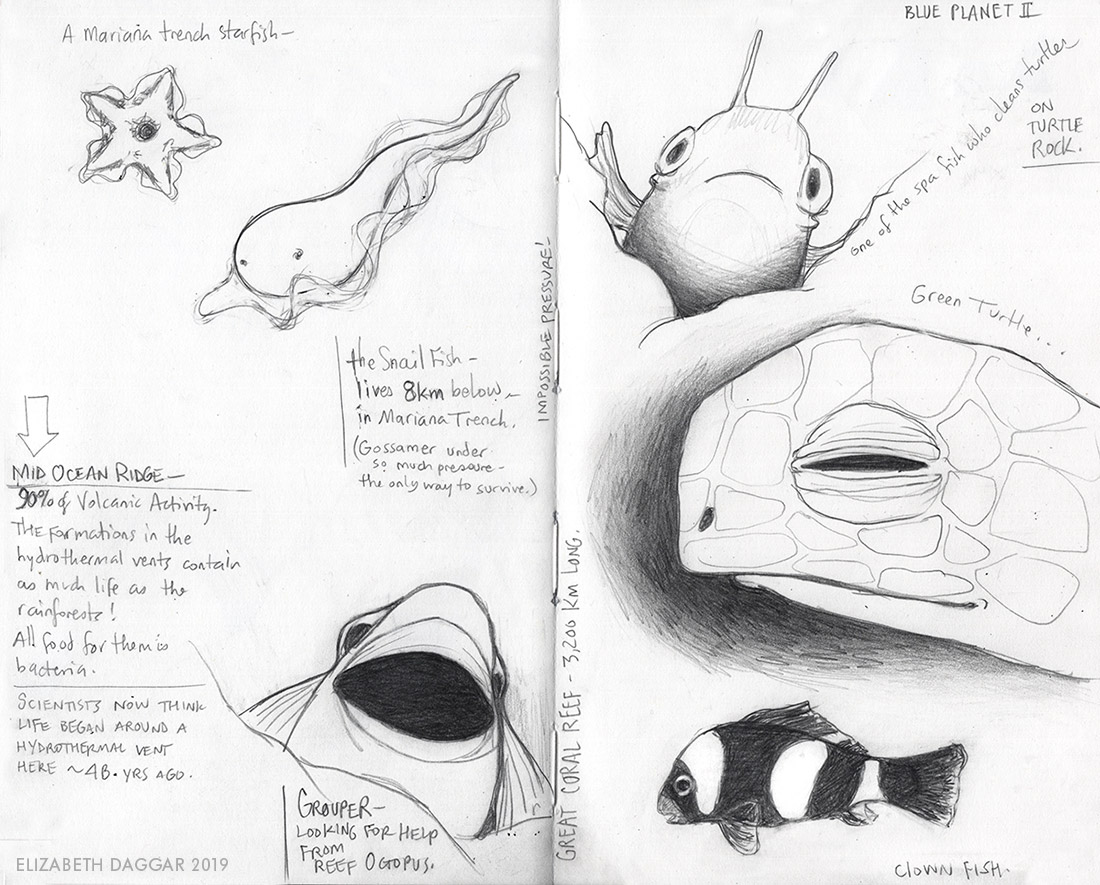 When I watch something like Blue Planet II, practically every frame of the incredible footage begs to be drawn or painted, so I spent several hours last night sketching some of the beasties— and consequently missing many of the others. Next time I can draw some of the ones I missed this time around.