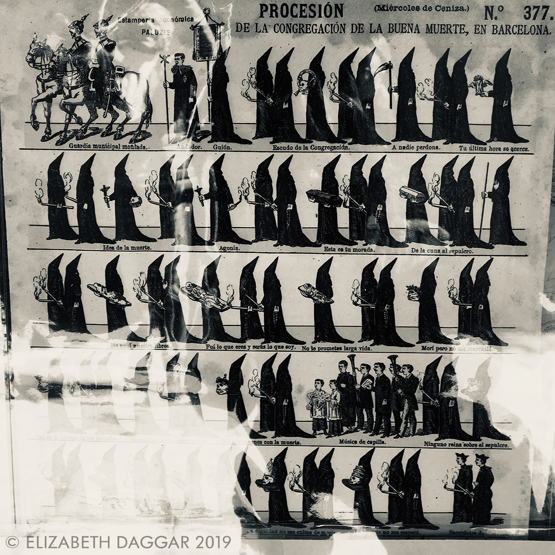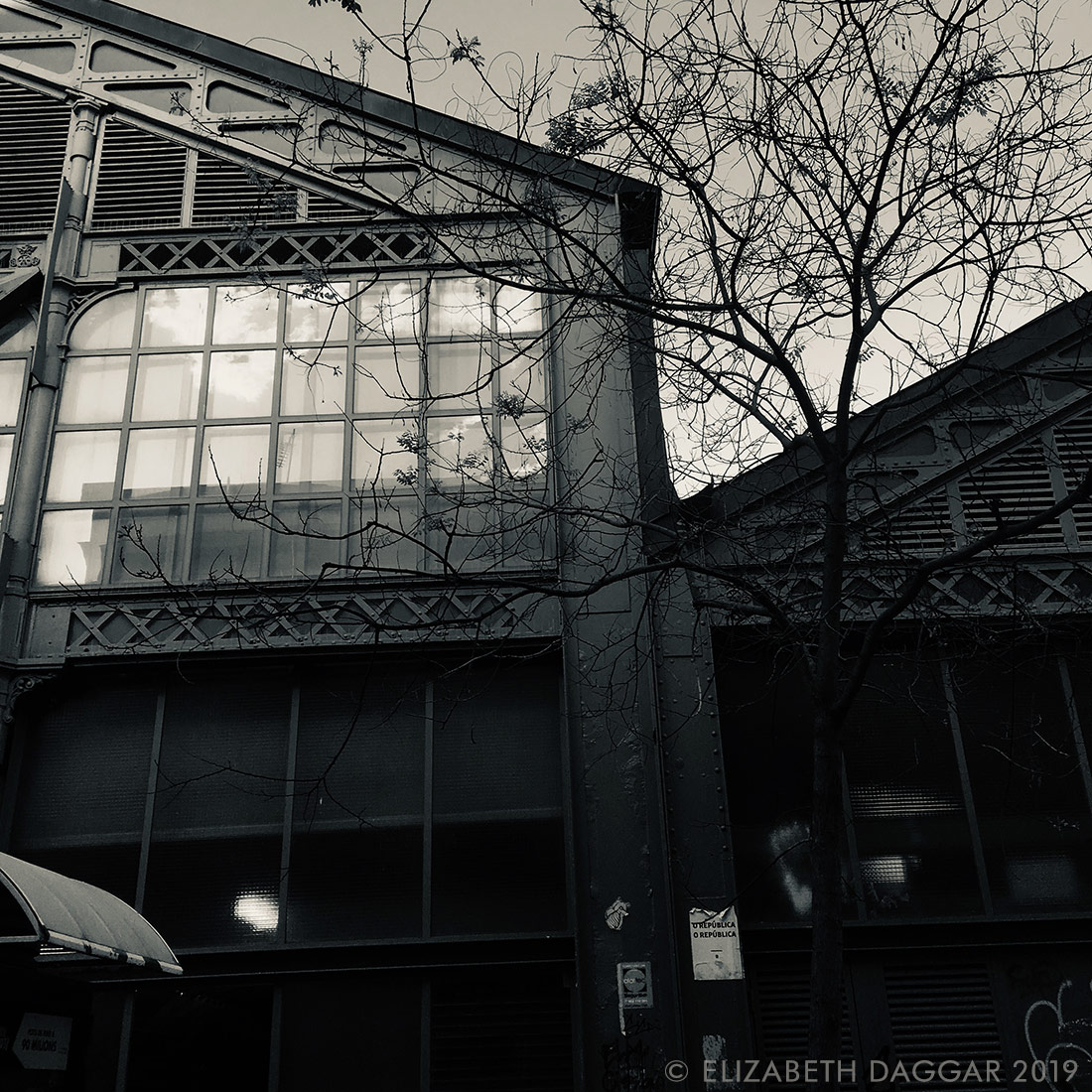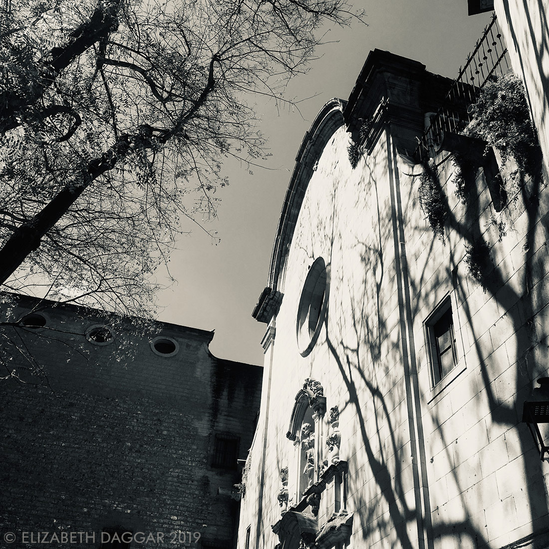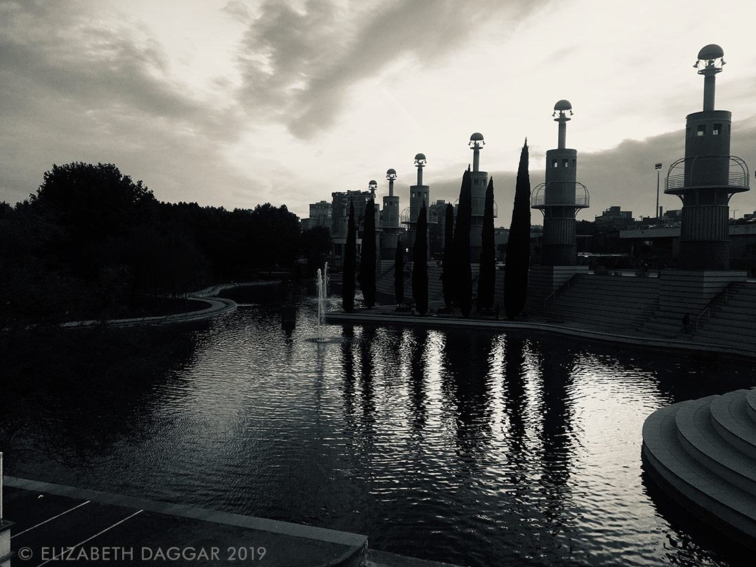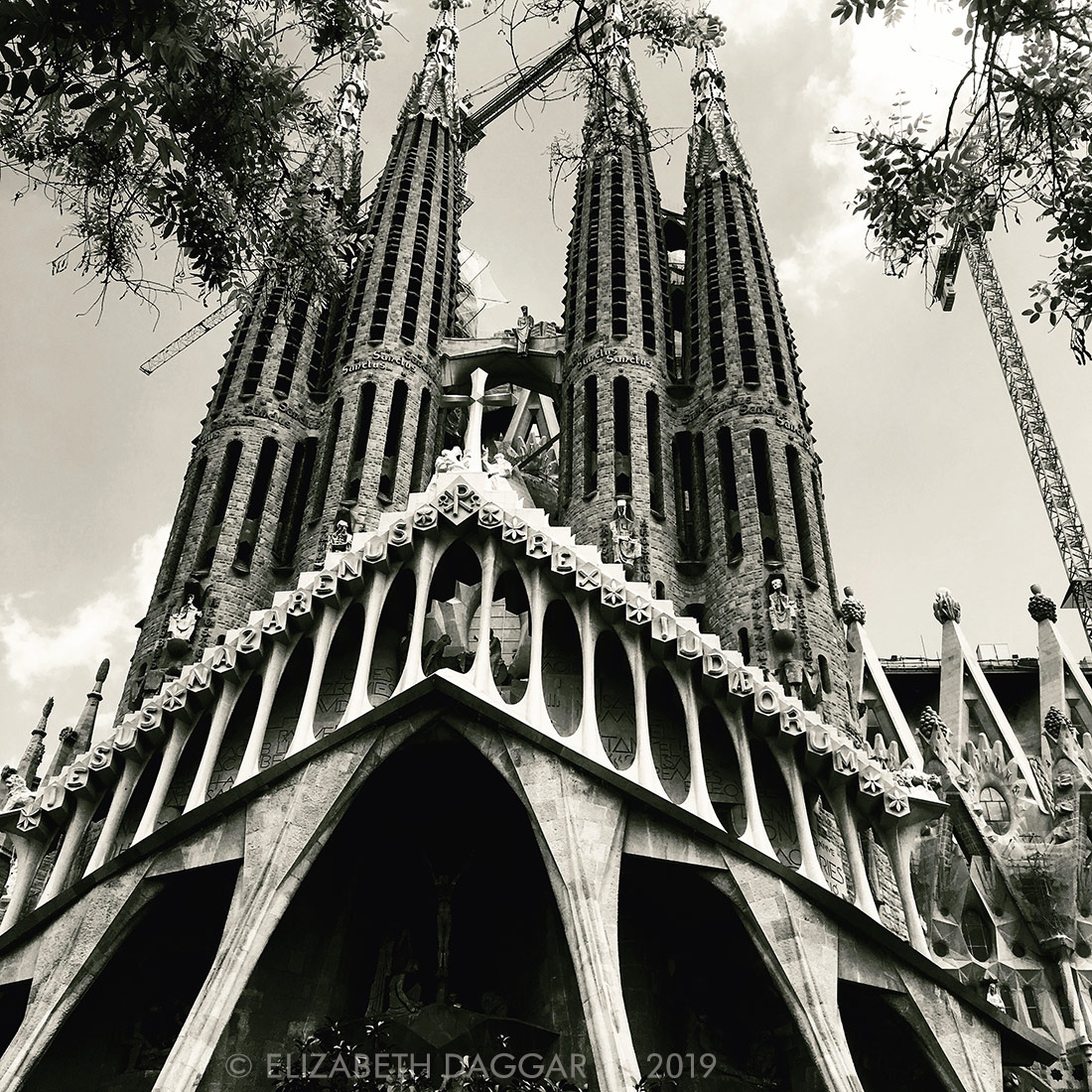 Barcelona cathedral in black and white from our first morning wandering around.An old document spied in a window in the Gothic Quarter— “procession for a good death”Silhouetted walkers in El Born, near the Gothic Quarter Shadows of trees on a stonework building The Museu Nacional d’Art de Catalunya in early eveningThis large scale sculpture sits in front of the museum, while tall columns uphold nothing in the distance. This is in around the steps leading down to the Magic Fountain.Dusk falls over the waterfalls that lie between the steps leading down to the fountainAnother sunny exploration day: Gaudi’s La Sagrada Familia, on of the façadesThe side street Façade of Casa Mila, another of Gaudi’s biomorphic masterworks.Here’s a view of the water feature in the Industrial Park nearby the Sants train stationAnd here’s part of a façade of a modern market hall building in Barceloneta. Seen in whole, it looked like a kind of steampunk spaceship.