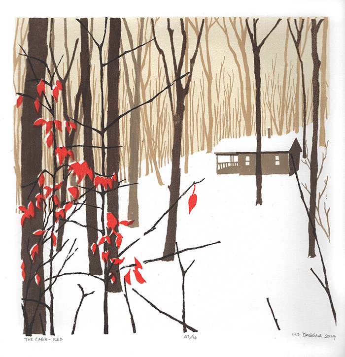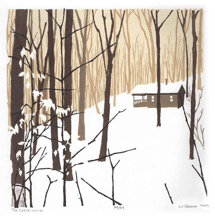 Below are two variations from several small editions of a cabin scene. This was inspired by a sort fo history / archiving project undertaken by a friend and I. We realized that our inclination to go cabin camping with friends in the off-seasons has been ongoing for about 15 years, and I wanted to commemorate it.