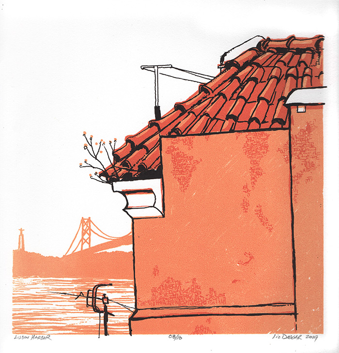 Above is a finished print from the edition of Lisbon silkscreens I was working on when last I posted. It’s a three-color rendition of a pen-and-marker sketch I did sitting on the balcony of our little apartment there, perched above the harbor.