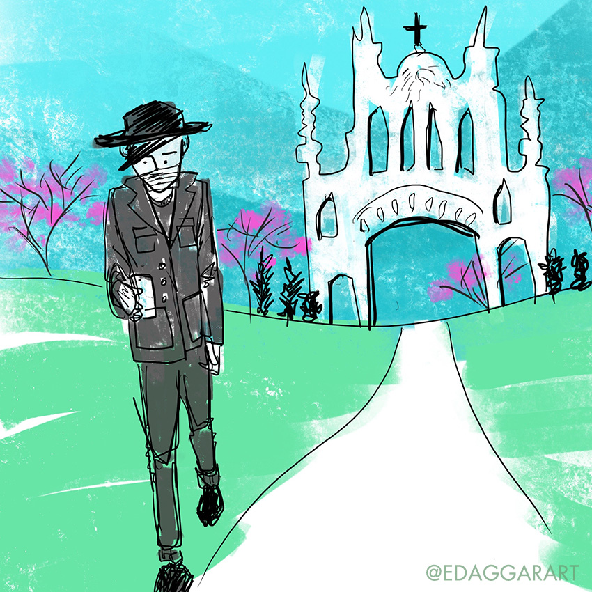 The below is one that I did last evening, based on a person we saw leaving the cemetery when were arriving. I had no intention at the time I made a mental note to draw them, that it would wind up being in these insanely cute and happy Easter egg colors, but that’s something that has been coming out in the mask drawings. Digital has been pulling me in ways that I don’t often go when I’m working with real paper and materials.