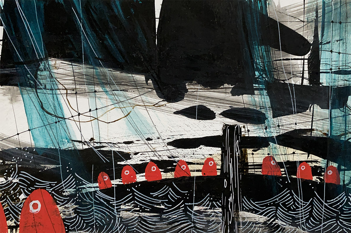 There’ve been many additional Ohm ink drawings and acrylic paintings on paper since. Their story is unfolding more with each new piece. I’ve been painting a number of ink-black landscapes, too. It’s all kind of exploration and experimentation. Less a slave to the tyranny of detail / realism— expressive marks and no sketches, no roadmaps!